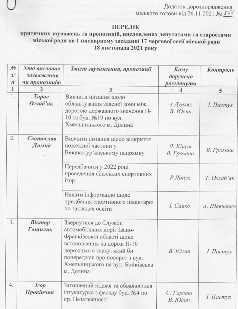 1.Апарату міської ради, підприємствам, організаціям та установам міста розглянути пропозиції і зауваження, які були висловлені депутатами та старостами на 1 пленарному засіданні 17 чергової сесії міської ради 18 листопада 2021 року (додаються).