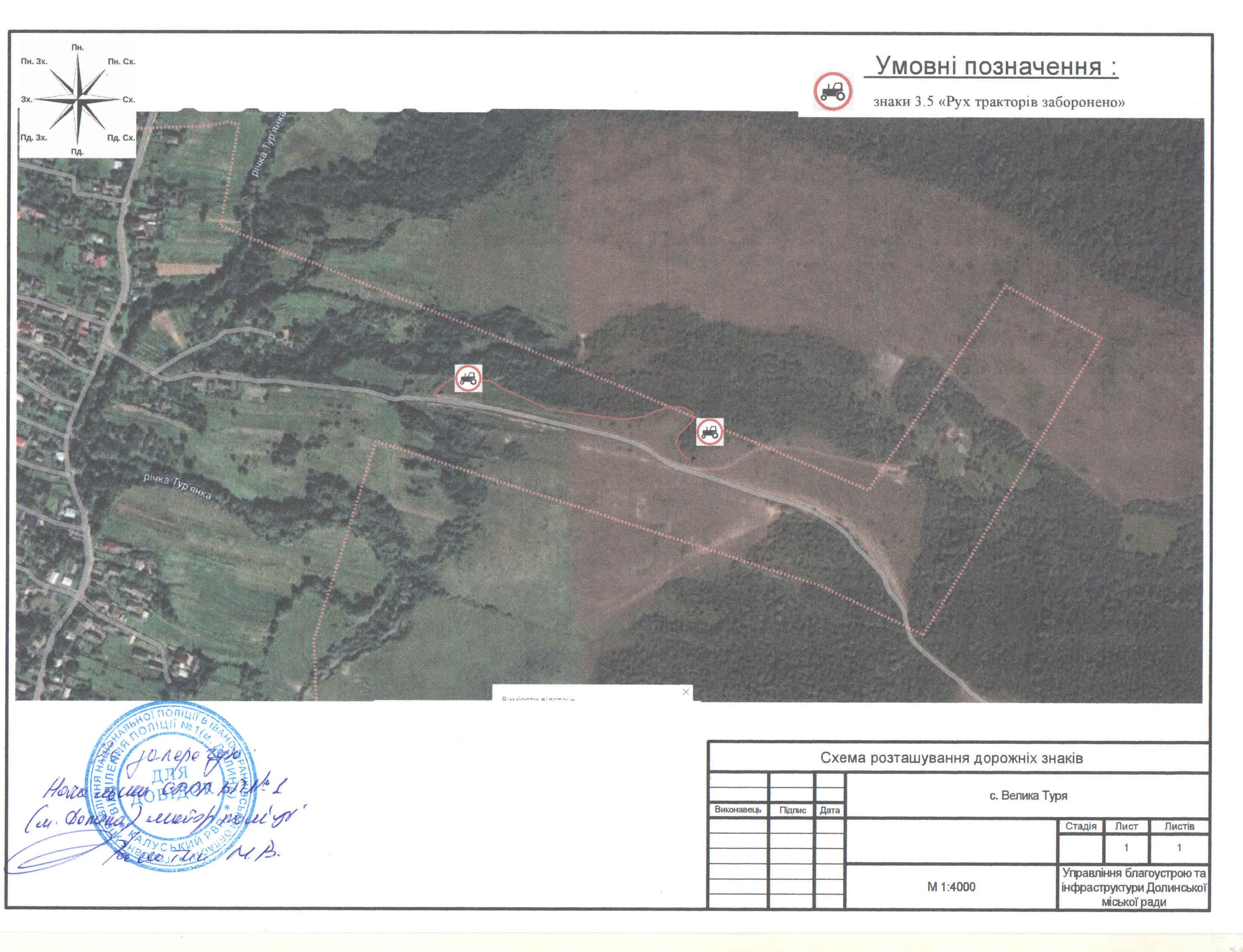 1. Затвердити схему організації дорожнього руху а саме розміщення знаків 3.5 «Рух тракторів заборонено» при в’їзді на під’їзну дорогу по вул. Селищна 8, в с. Велика Тур’я, Калуського району, Івано-Франківської, погодженої відділенням поліції №1 (м. Долина) Калуського РВП в Івано-Франківській області (схема додається).