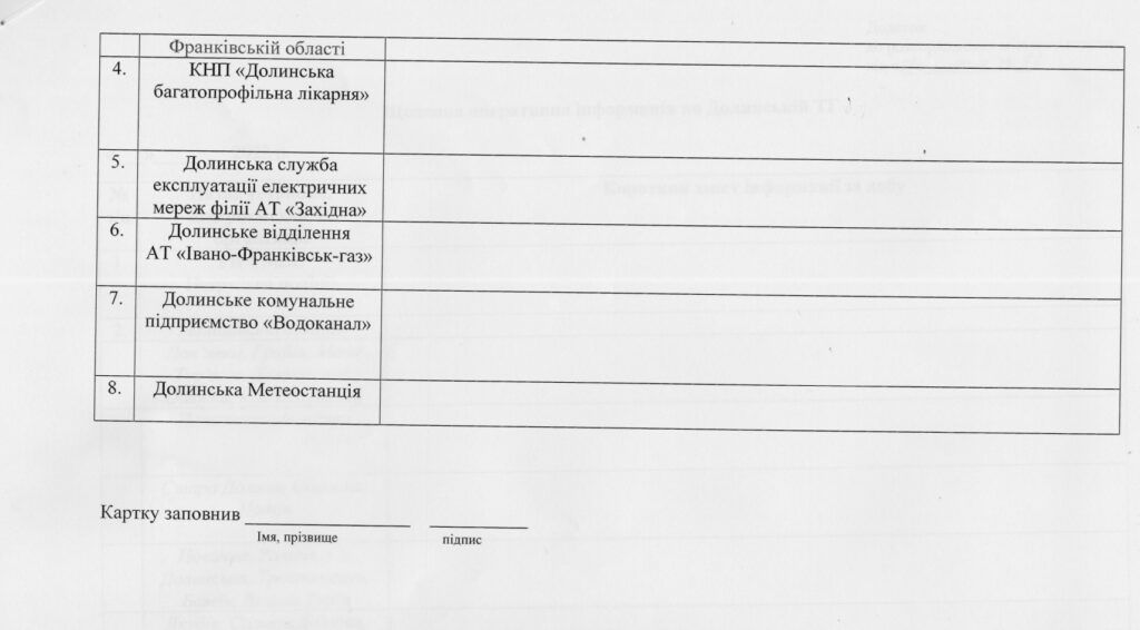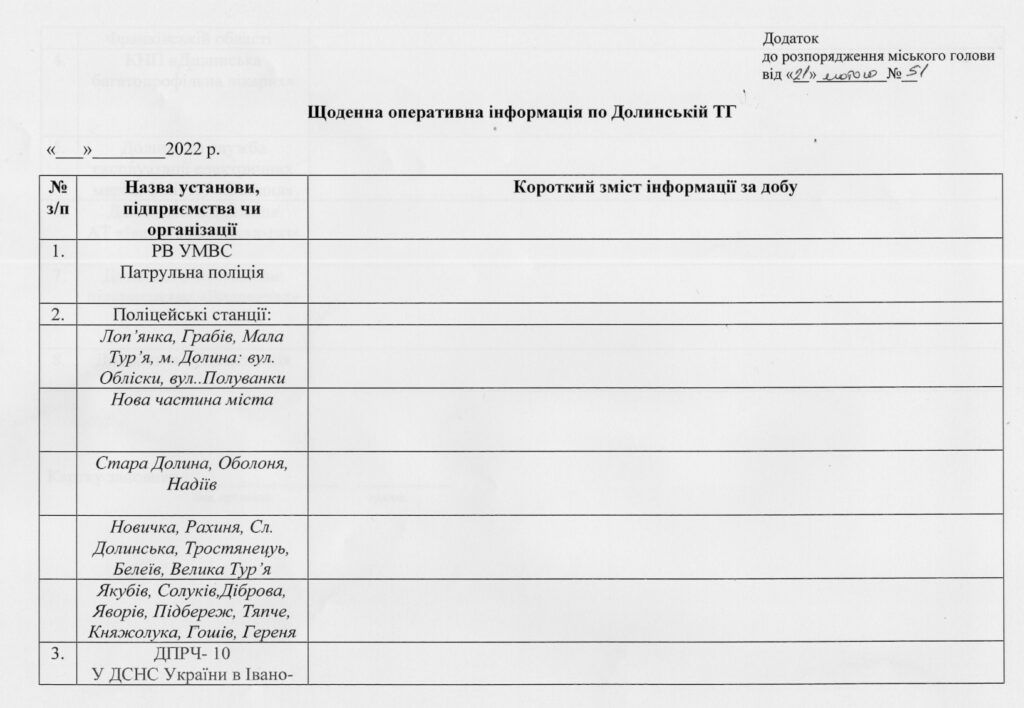 1.Встановити обов’язковий порядок щоденного збору та подачі керуючому справами (секретарю) виконавчого комітету оперативної інформації по Долинській територіальній громаді за формою, що додається.