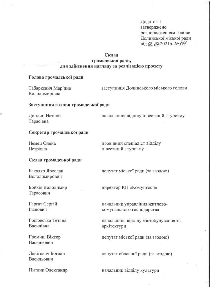 1.Створити громадську раду, для здійснення нагляду за реалізацією проекту «Створення системи комплексних заходів для розвитку туризму у Долинській ОТГ» у складі згідно з Додатком 1.