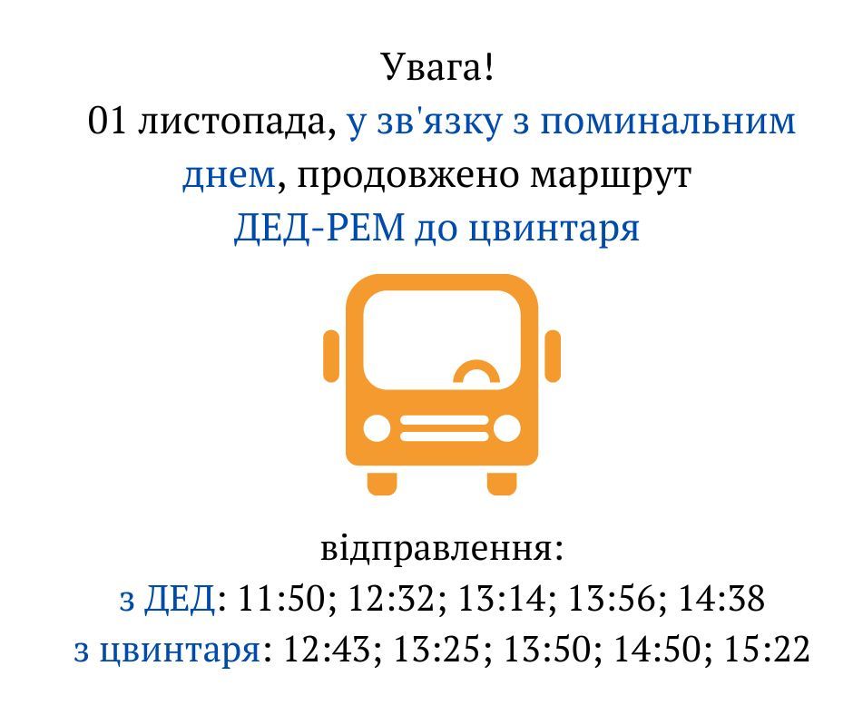 01 листопада, у зв’язку з поминальним днем, буде продовжено маршрут ДЕД-РЕМ до цвинтаря