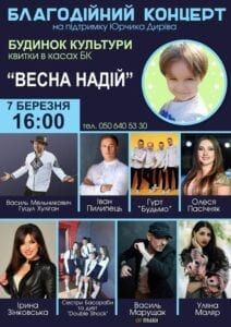 7 березня, 16:00 година – благодійний концерт «Весна надій» на підтримку Юрчика Диріва