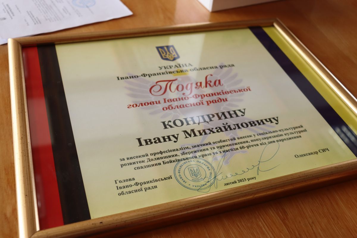 Сьогодні, під час засідання 31-ї позачергової сесії міської ради, Івану КОНДРИНУ міський голова вручив Подяку за високий професіоналізм, значний особистий внесок у соціально-культурний розвиток Долинщини, збереження та примноження, популяризацію культурної спадщини Бойківського краю та з нагоди 60-річчя від дня народження.