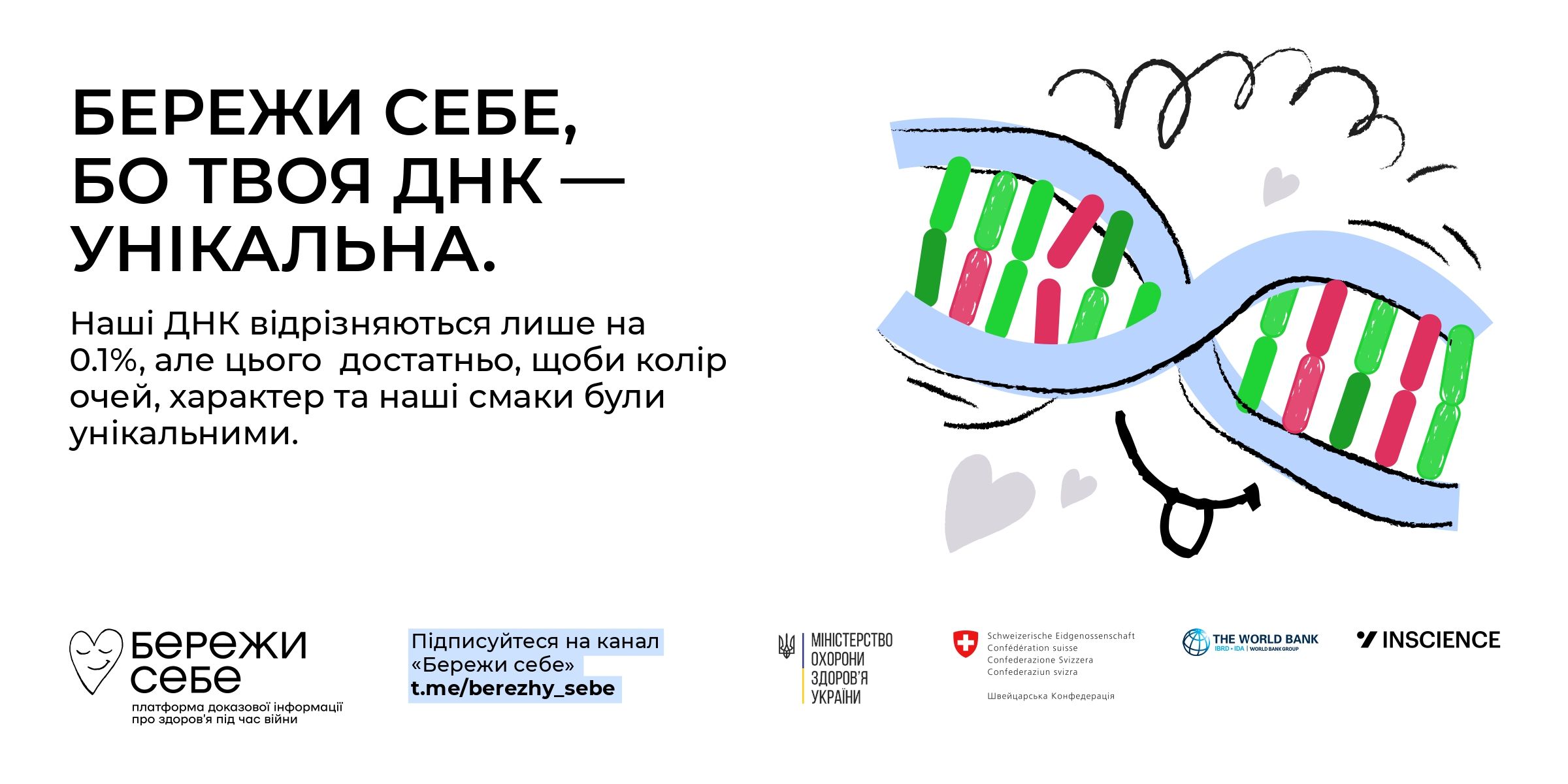 - Бережи себе, бо твоя ДНК – унікальна (Наші ДНК відрізняються лише на 0.1%, але цього достатньо, щоби колір очей, характер та наші смаки були унікальними).
