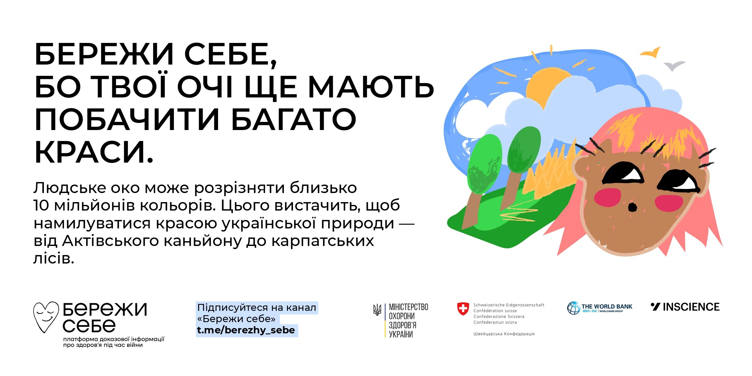 - Бережи себе, бо твої очі мають побачити ще так багато краси (Людське око може розрізняти близько 10 мільйонів кольорів. Цього вистачить, щоб намилуватися красою української природи — від Актівського каньйону до карпатських лісів).