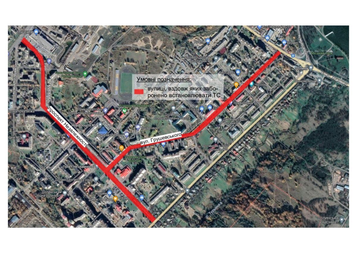 - вздовж вулиці Грушевського та проспекту Незалежності, якщо ТС орієнтована на осьову дорогу вказаних вулиць та сприймається з дороги, окрім випадків, коли ТС блокується до будівлі та сприймається разом з будівлею, як цілісний об’єкт (рис)