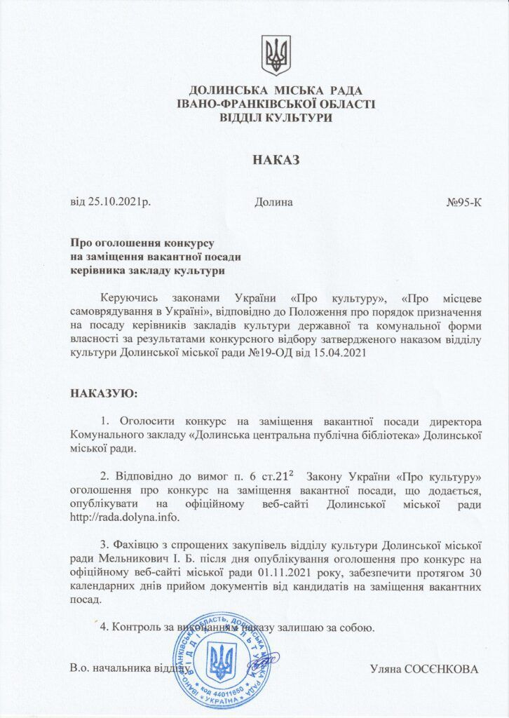Відділ культури Долинської міської ради оголошує конкурс на заміщення вакантної посади директора КЗ «Долинська центральна публічна бібліотека» Долинської міської ради (місце знаходження закладу: вул. проспект Незалежності, 19а, м. Долина, Калуського району, Івано-Франківської області).
