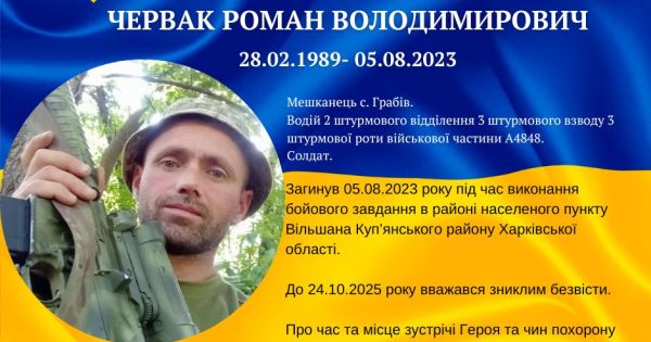 З глибоким болем повідомляємо про загибель Захисника України — Червака Романа Володимировича, мешканця села Грабів. Солдат, водій штурмового відділення військової частини А4848, віддав своє життя за Батьківщину 5 серпня 2023 року під час виконання бойового завдання на Харківщині. До жовтня цього року він вважався зниклим безвісти…
