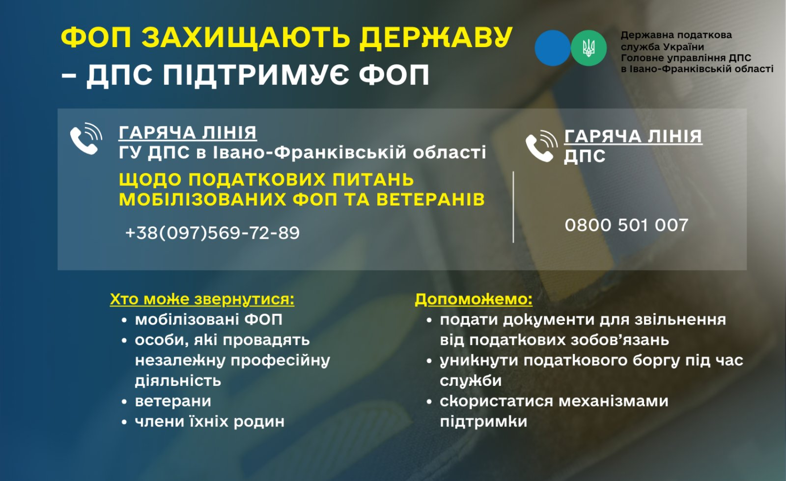 В ГУ ДПС в Івано-Франківській області створено «гарячу лінію» для вирішення податкових питань мобілізованих ФОП та ветеранів