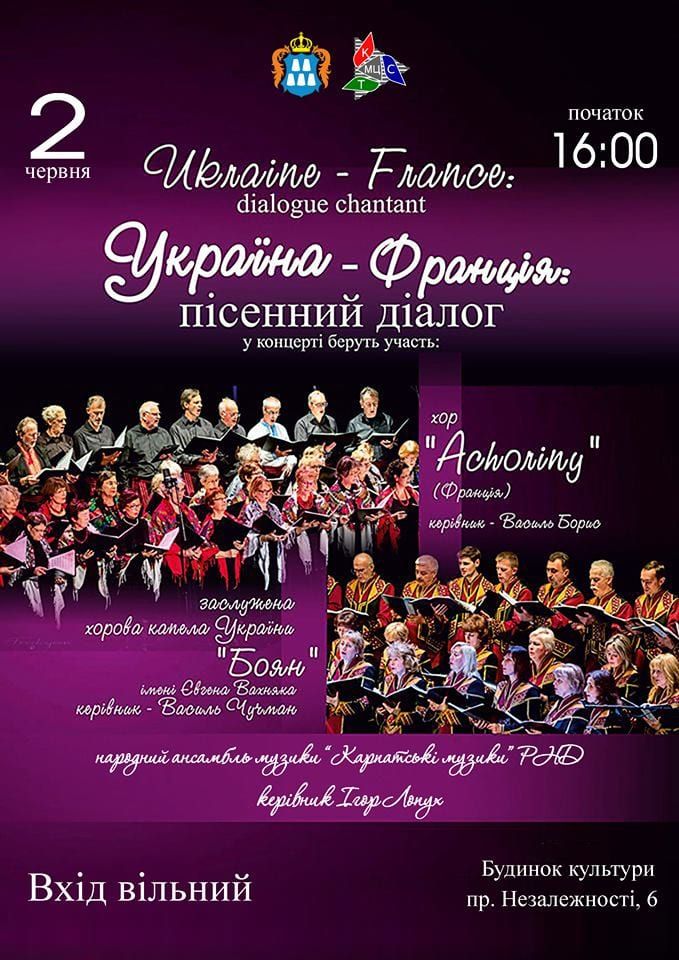 2 червня – спільний концерт заслуженої хорової капели України “Боян” імені Євгена Вахняка та хору “Achoriny” (“Акоріні”) з Франції.