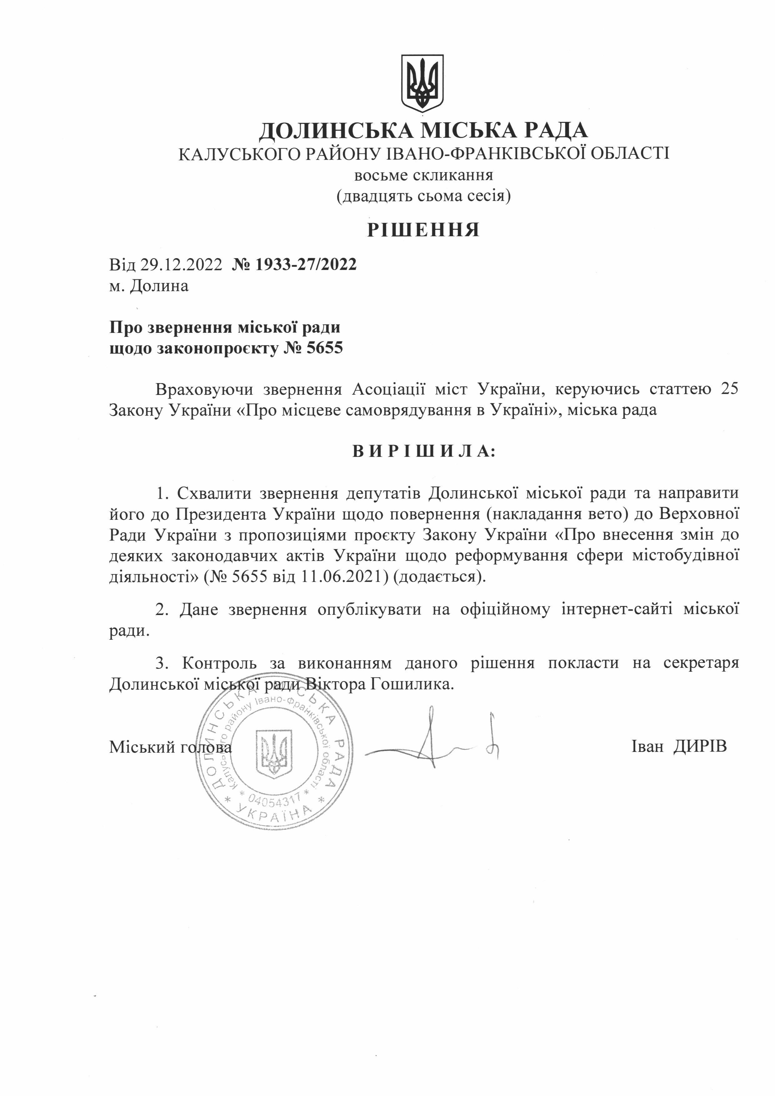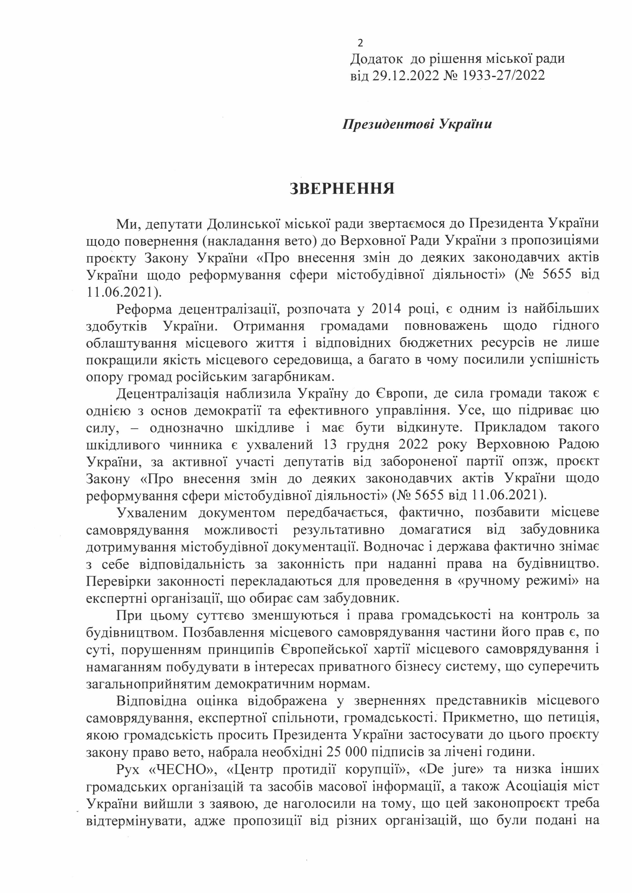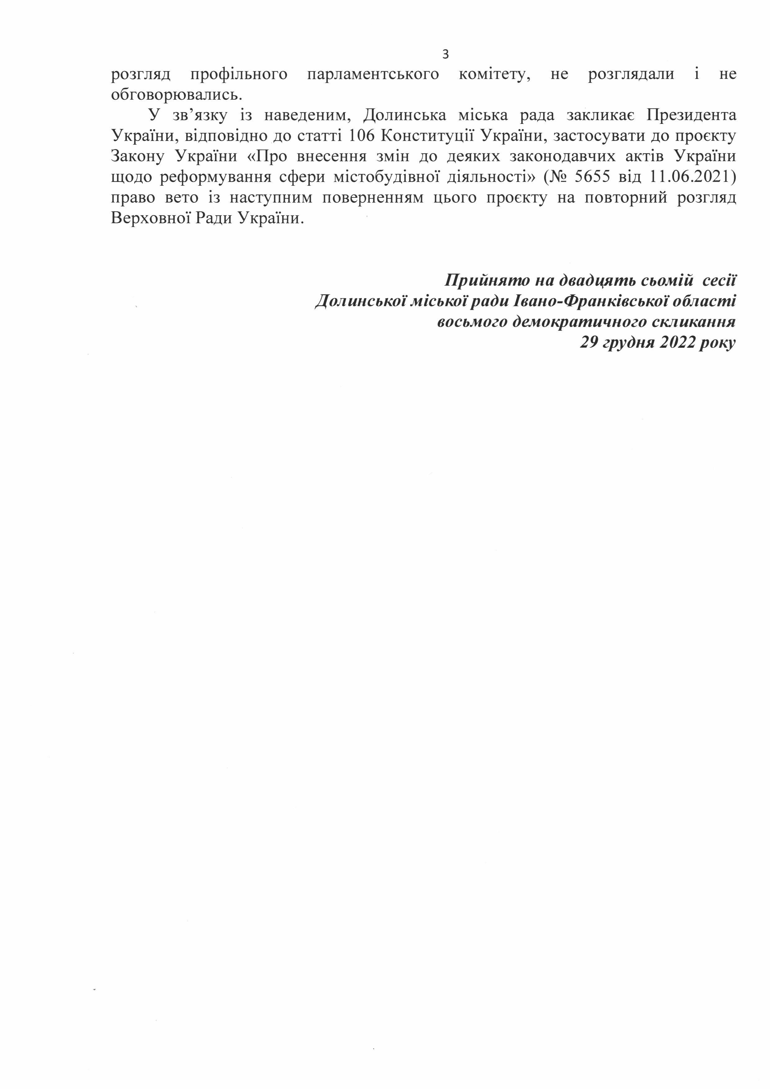 Депутати Долинської міської ради звертаються до президента України Володимира Зеленського, аби він ветував закон № 5655 “Про внесення змін до деяких законодавчих актів України щодо реформування сфери містобудівної діяльності”