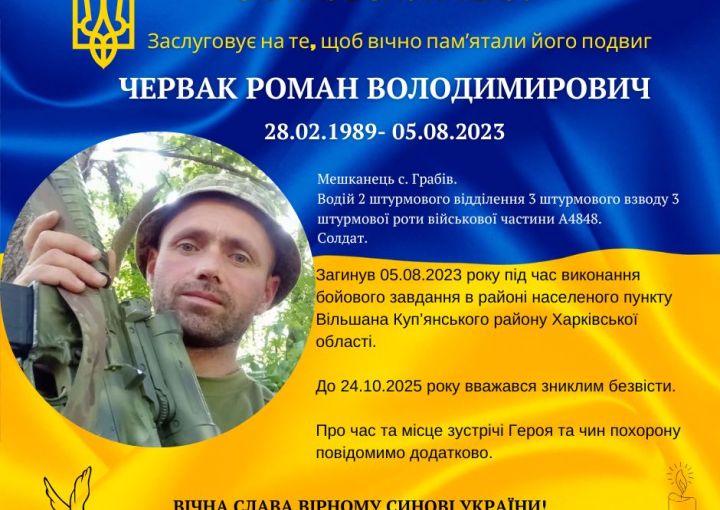З глибоким болем повідомляємо про загибель Захисника України — Червака Романа Володимировича, мешканця села Грабів. Солдат, водій штурмового відділення військової частини А4848, віддав своє життя за Батьківщину 5 серпня 2023 року під час виконання бойового завдання на Харківщині. До жовтня цього року він вважався зниклим безвісти…