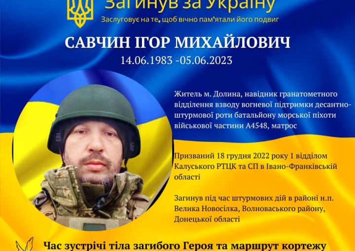 Захищаючи нашу землю від російського агресора, загинув мешканець Долини САВЧИН ІГОР МИХАЙЛОВИЧ.